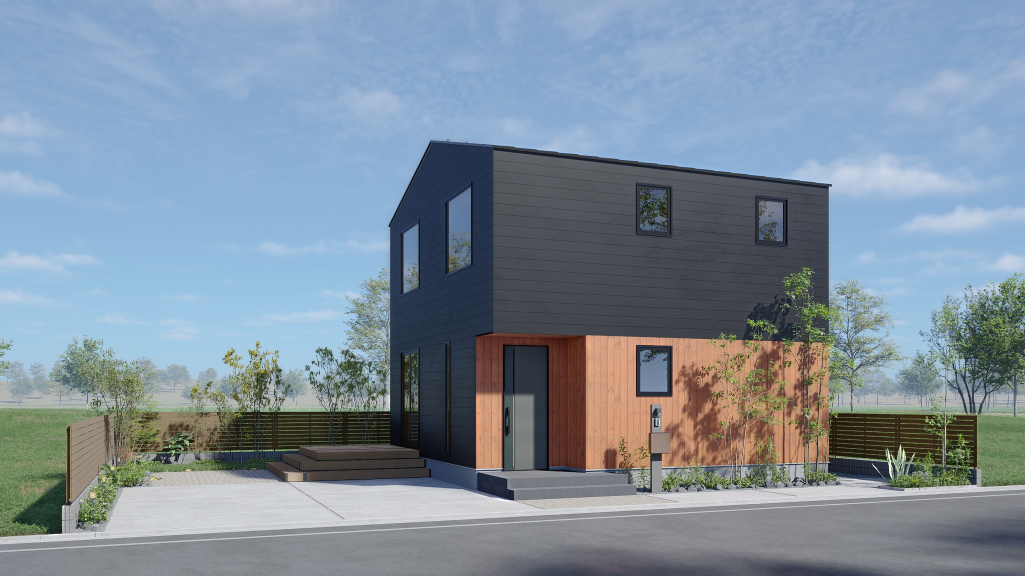 コストパフォーマンスを重視し限られた空間で最大限の効果を発揮できるシンプルな形状に、無垢のカラマツ材を加えることで単調になりがちな総2階の家を魅力ある外観を実現